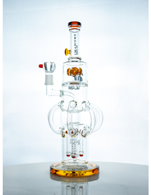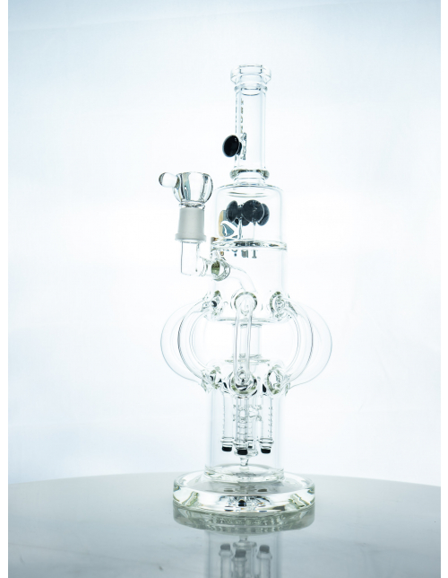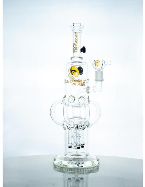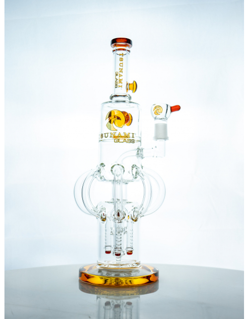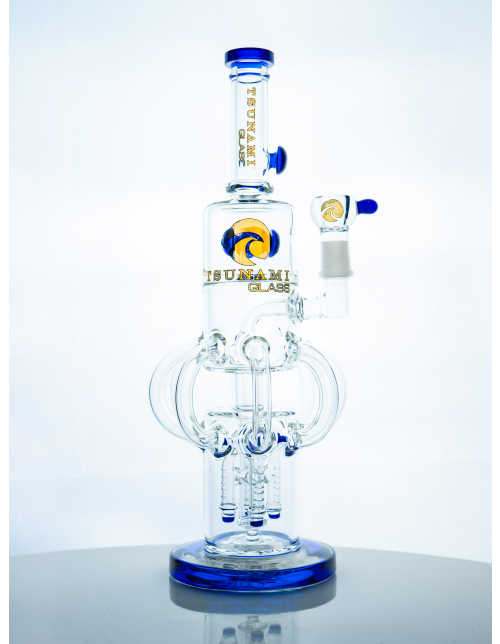 The Tsunami Rocktapus water pipe is rocking filtration, with an aquatic look and feel. Smooth and tasty hits are delivered through a multiple percolator system, you can watch as it works. With four slotted rocket shaped diffusers, puffs are infused with bubbling water action. You’ll see the smoke swirl and cool through eight external cooling tubes, while a spore percolator finishes the mellow hit. Inhales exit a cleanly built, and sturdy pipe with an extra thick stable round foot. The Tsunami Rocktapus is futuristic in purifying puffs, with equally impressive aesthetics.