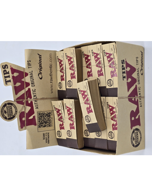 The image displays a box of RAW Natural Unrefined Tips, which are used for rolling cigarettes or joints.