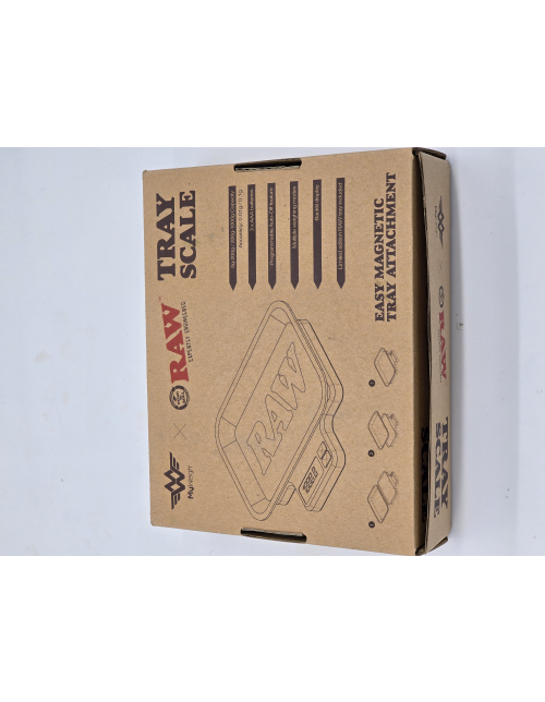 - The packaging features a black line-drawing illustration of the tray scale, showing the RAW-branded tray attached to the scale unit.